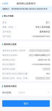 受讓方應認真核對股權轉讓信息,核對完成后選擇“核對結果”。若“核對無誤”則直接點擊“提交”,若選擇“核對有誤”則應填寫相應原因后點擊“提交”。對于受讓方確認不通過的,納稅人需根據(jù)受讓方反饋信息進行修改,并重新提交至受讓方確認;對于受讓方確認通過的,會自動轉入稅務機關受理審核環(huán)節(jié)。