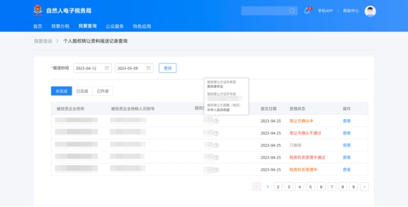 在自然人電子稅務局(WEB端)“我要查詢”——“個人股權轉讓資料報送記錄查詢”模塊可以查看主管稅務機關對股權轉讓材料的審核進度。