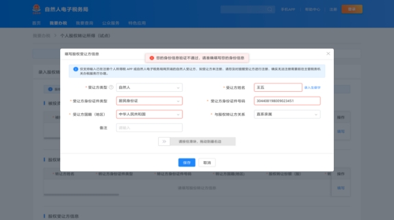 點擊“股權受讓方信息”右側的“填寫”,進入填寫頁面。選擇受讓方類型,填報股權受讓方相關信息。這里需要注意的是,如果受讓方為自然人,需已實名注冊個人所得稅APP,如尚未注冊,需先行注冊后再辦理。填寫完成后點擊“保存”,轉入下一步操作。