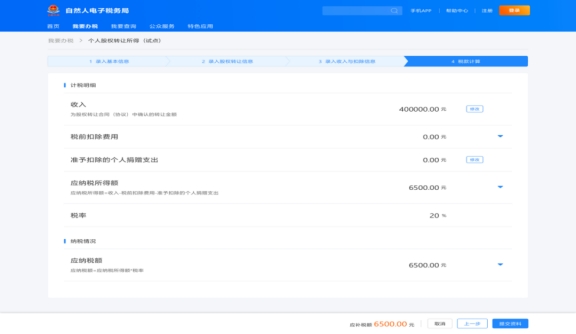 轉讓方申報的最后一個步驟,系統(tǒng)會自動根據(jù)前三步的填報數(shù)據(jù),展示本次轉讓的計稅明細及需要繳納的個人所得稅。確認無誤后點擊“提交資料”,股權轉讓信息就會提交至受讓方進行核對。