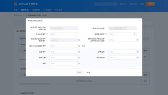 填寫轉讓合同編號、股權變動時間以及企業(yè)凈資產、實收資本、未分配利潤等相關信息。填寫完成后點擊“保存”,轉入下一步操作。