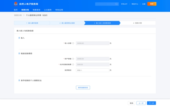 在錄入收入和扣除信息模塊,查看和錄入收入、稅前扣除費用、準予扣除的個人捐贈支出相關信息,核實無誤后點擊下一步。