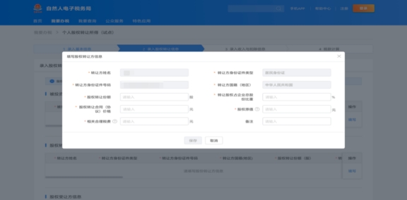 點擊“股權轉讓方信息”右側的“填寫”,進入填寫頁面。填報股權轉讓份額、轉讓股權占企業(yè)總股份比重、股權轉讓合同價格、股權原值、相關合理稅費,填寫完成后點擊“保存”,轉入下一步操作。