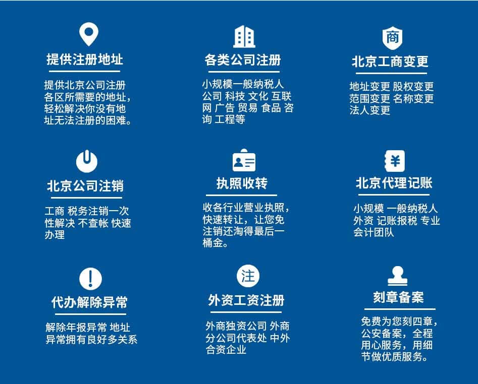 北京注冊公司流程及費用我都整理好啦!代辦個體公司營業(yè)執(zhí)照辦理,提供北京公司注冊地址,正規(guī)公司注冊代辦代理記賬公司,公司變更,股權(quán)變更,公司注銷轉(zhuǎn)讓一站式優(yōu)質(zhì)服務。