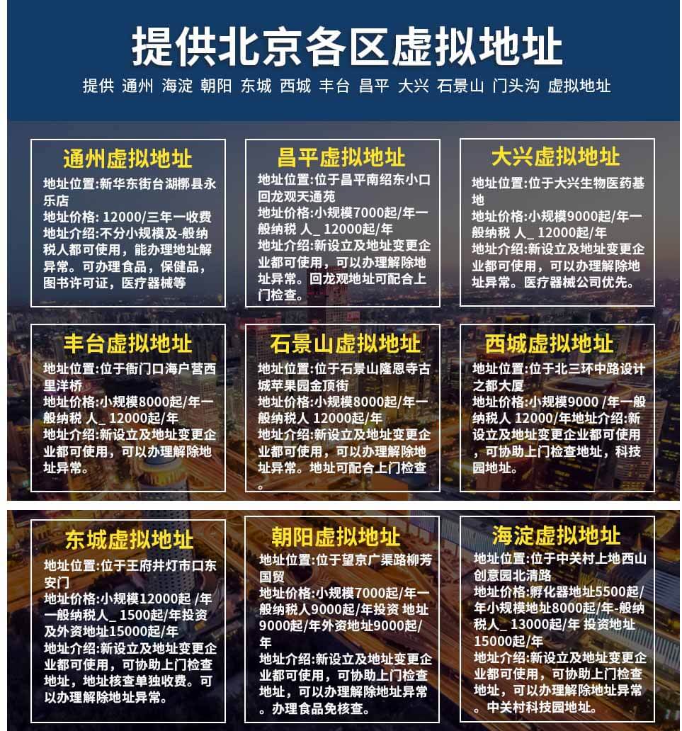 什,北京注冊公司免費地址平谷,么是虛擬注冊地址地址(集中工作區(qū)或,在北京注冊公司無地址怎么辦,公司孵化器)?通俗來講“虛擬注,北京出租公司注冊地址,冊地址”就是你不需求實際租賃一間工作室,北京注冊公司地址費用,來注冊公司、而由工商局、稅完結(jié)工作,北京公司代辦公司注冊地址,作局準許的“公司孵化器”供給給,北京注冊公司有哪些地址,你一個房間號用來公司注冊、其作用只是用,在北京注冊分公司需要實體地址,來工商注冊,處理營業(yè)執(zhí)照用的,但是,北京無地址公司注冊多少費用,你不可以以來注冊地工作的一種服,北京公司注冊地址收費,務。