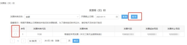 4、進入“發(fā)票驗(交)舊”模塊,選中要驗舊的票種,點擊“驗舊”。