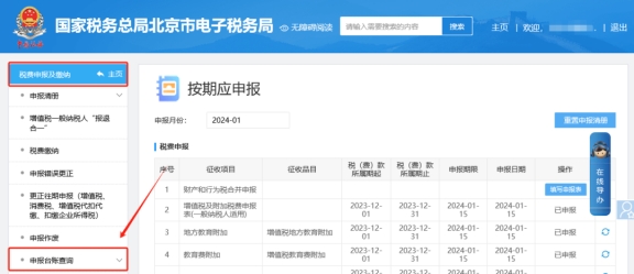 二、稅費(fèi)申報及繳納—申報臺賬查詢,查詢即可。