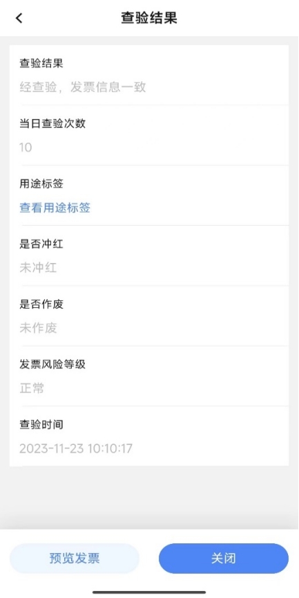查驗本人發(fā)票,且結(jié)果一致時,反饋查驗結(jié)果“經(jīng)查驗,發(fā)票信息一致”,同時展示發(fā)票票面信息、發(fā)票標(biāo)簽信息(包括發(fā)票用途標(biāo)簽及紅字發(fā)票標(biāo)簽等)及發(fā)票查驗時間等信息;點擊【預(yù)覽發(fā)票】可以預(yù)覽發(fā)票的票面。查詢結(jié)果不一致的,反饋結(jié)果“經(jīng)查驗,發(fā)票信息不一致”,查驗結(jié)果為不一致時不可預(yù)覽發(fā)票。若未查到該發(fā)票信息,反饋結(jié)果為“未查詢到該發(fā)票信息”。