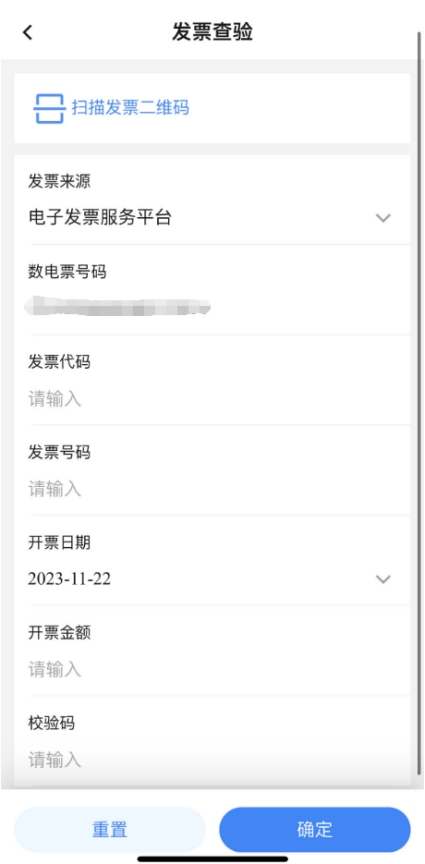 進入“發(fā)票查驗”頁面,可通過掃描已開具發(fā)票的票面二維碼帶出相關(guān)信息,也可在頁面手動錄入發(fā)票相關(guān)信息后點擊【確定】按鈕;若為本人發(fā)票,則只錄入發(fā)票號碼就可以查驗,若為第三方發(fā)票,則提示填入開票日期及開票金額(含稅金額)后進行查驗。