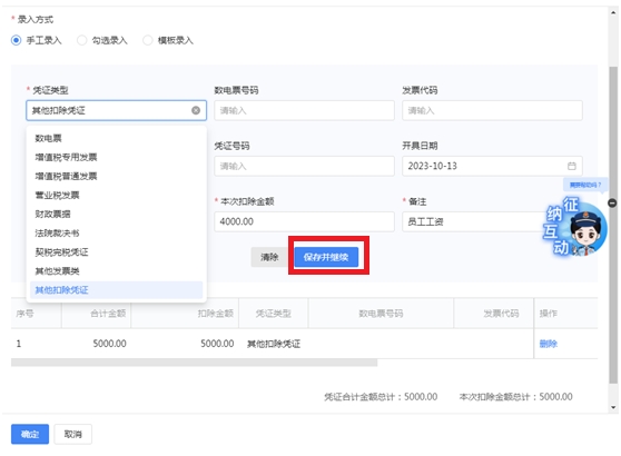 根據(jù)實(shí)際情況選擇差額扣除憑證類型,并錄入相關(guān)憑證信息(如勞務(wù)派遣服務(wù)中代用工單位支付給勞務(wù)派遣員工的工資、福利和為其辦理社會(huì)保險(xiǎn)及住房公積金),包括憑證合計(jì)金額和本次扣除金額,點(diǎn)擊【保存并繼續(xù)】。