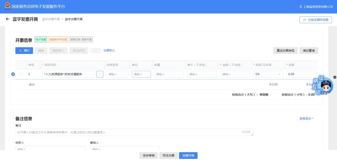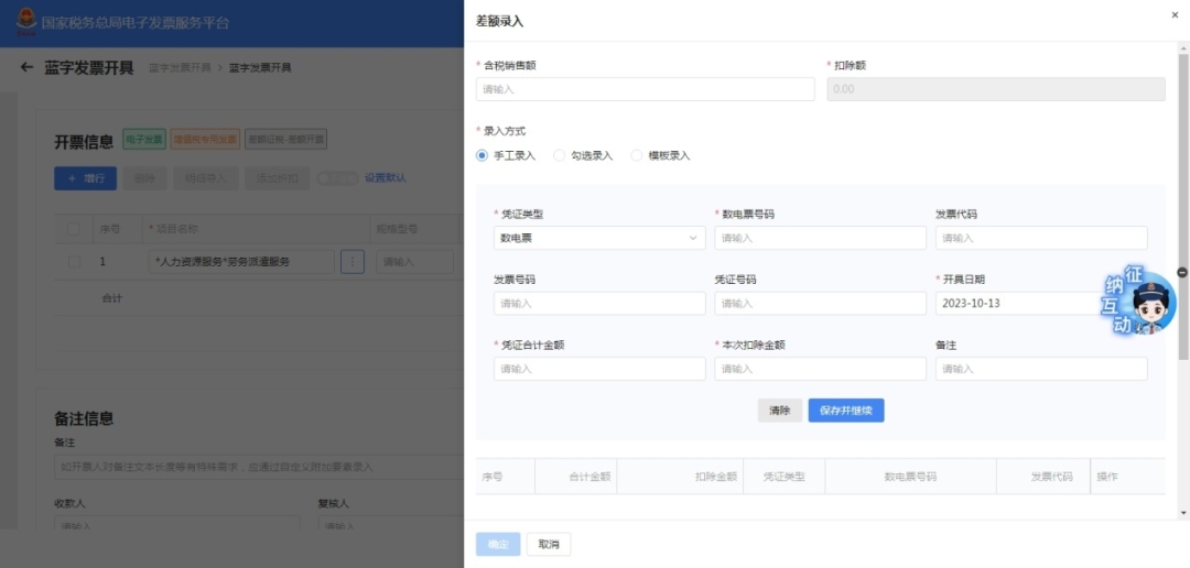 3.填寫(xiě)購(gòu)買方信息后,錄入或選擇項(xiàng)目開(kāi)票名稱“人力資源服務(wù)*勞務(wù)派遣服務(wù)”,自動(dòng)彈出扣除項(xiàng)填寫(xiě)界面。