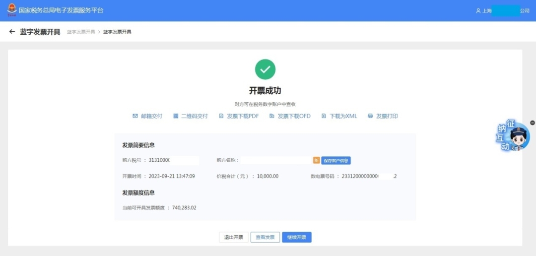1.核對(duì)開(kāi)票信息無(wú)誤后,點(diǎn)擊【發(fā)票開(kāi)具】按鈕,提示開(kāi)具成功,即完成發(fā)票開(kāi)具。