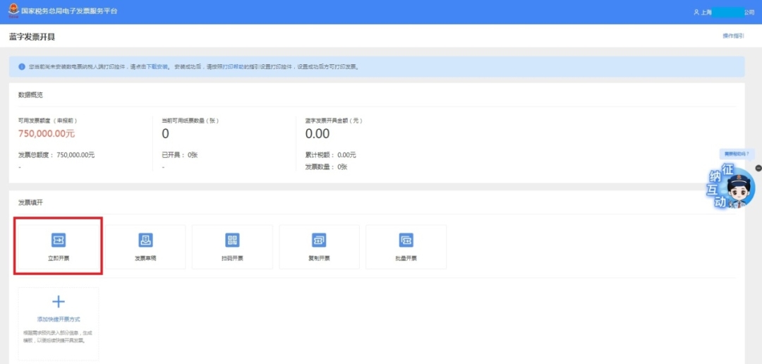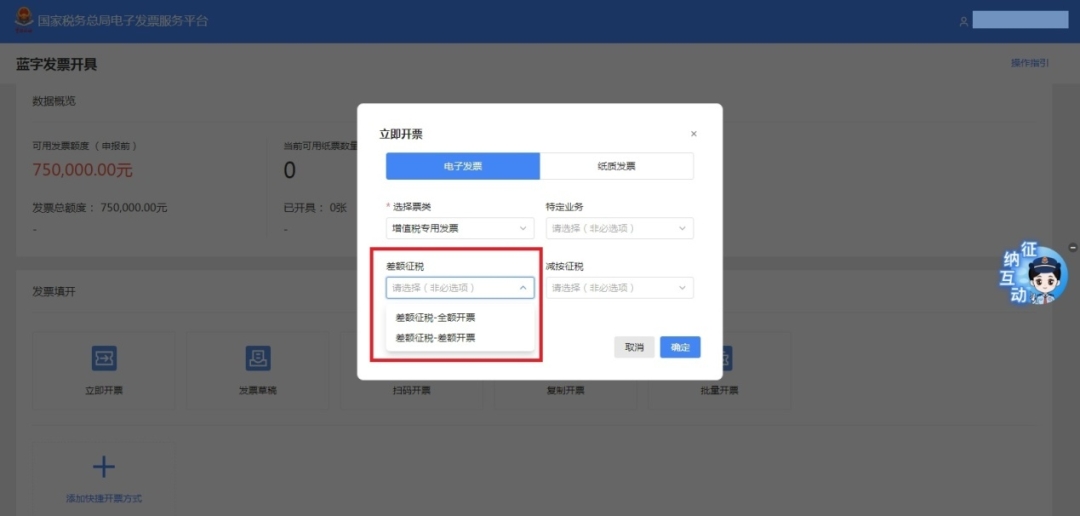 2.點(diǎn)擊【立即開(kāi)票】,選擇【差額征稅-差額開(kāi)票】進(jìn)入開(kāi)票界面。
