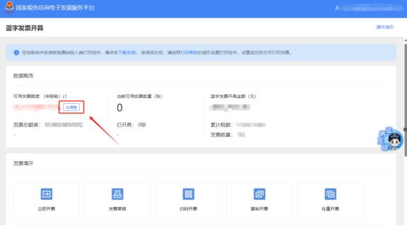 三、藍字發(fā)票開具頁面,點擊“可用發(fā)票額度”旁【去調(diào)整】按鈕,進入發(fā)票額度調(diào)整申請界面。