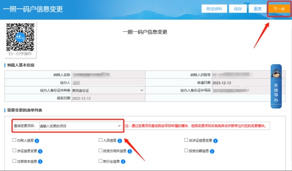 三、一照一碼戶(hù)登記信息變更頁(yè)面,在查詢(xún)變更項(xiàng)目中找相應(yīng)人員的移動(dòng)電話,填寫(xiě)變更后內(nèi)容,點(diǎn)擊下一步提交即可。