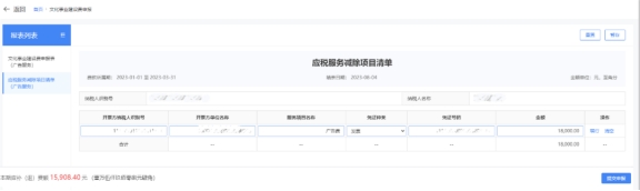 2)確認(rèn)數(shù)據(jù)是否正確,并進(jìn)行補(bǔ)充,點擊“編輯扣除項”可填寫《應(yīng)稅服務(wù)減除項目清單》。