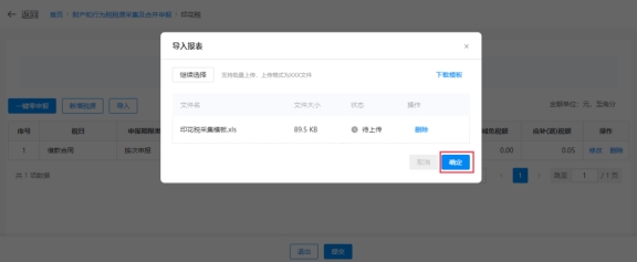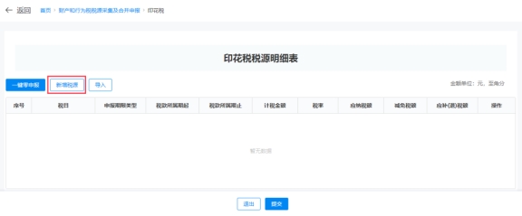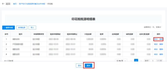 ?、苌蟼鞒晒螅到y(tǒng)在印花稅稅源明細(xì)表界面顯示上傳文件中的稅源信息(若需要改動(dòng)可手動(dòng)修改),確認(rèn)無(wú)誤,點(diǎn)擊【提交】。