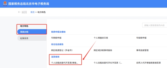 使用自然人身份登錄新電子稅局,是否可以代開自然人出租房屋增值稅電子普通發(fā)票?  答、可以,路徑為:【地方特色】—【我要辦稅】—【發(fā)票使用】—【個人出租房屋代開發(fā)票(增值稅電子普通發(fā)票)】?! D示指引如下  一、地方特色?! 《?、我要辦稅—發(fā)票使..