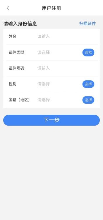 進入身份信息采集頁面。身份信息采集可以通過手動輸入姓名、證件類型、證件號碼、性別、國籍等信息或通過點擊右上角“掃描證件”,進入證件掃描界面,按提示進行證件掃描。