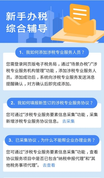2.4、登錄為企業(yè),且該企業(yè)是涉稅專業(yè)服務機構,展示:我如何添加涉稅專業(yè)服務人員、我如何填報新簽訂的涉稅專業(yè)服務協議、已采集協議,為什么不能幫企業(yè)辦理業(yè)務等輔導信息。
