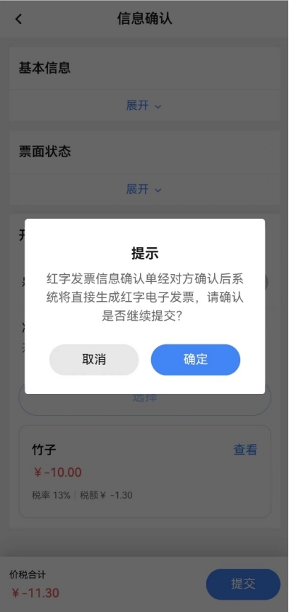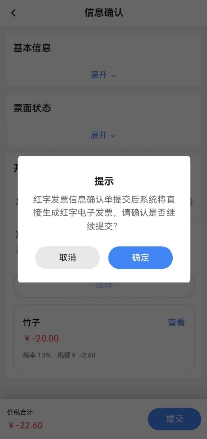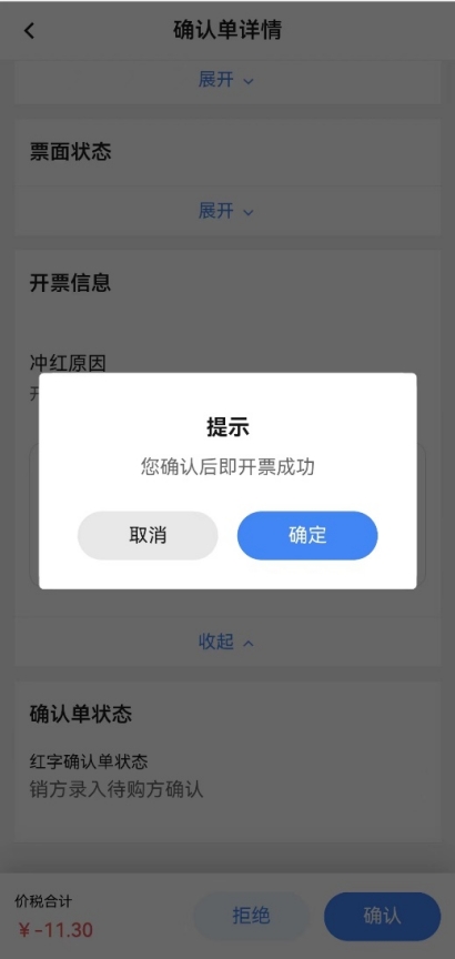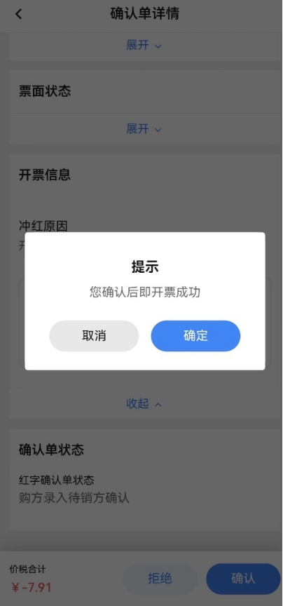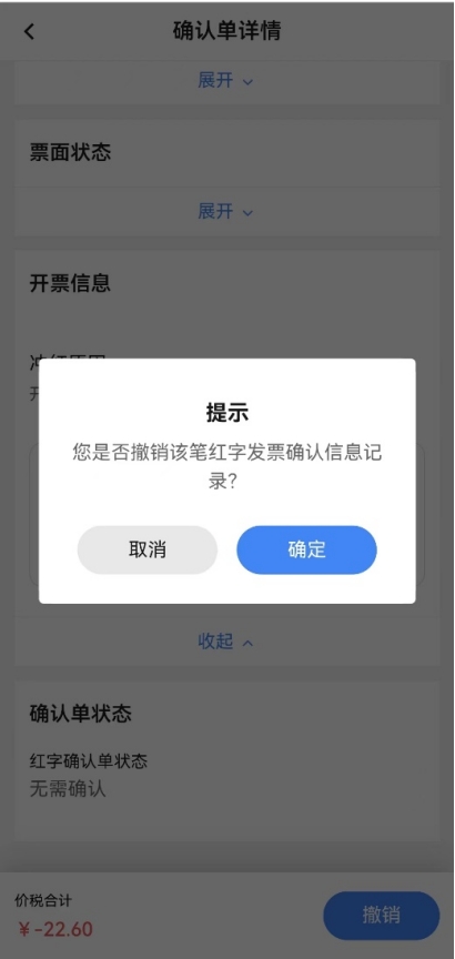 選擇需要處理的紅字信息確認(rèn)單,點擊后進(jìn)入“確認(rèn)單詳情”頁面。無需確認(rèn)的情況下銷方在紅字發(fā)票未開具前,點擊【撤銷】彈出撤銷提示,點擊【確定】成功撤銷此紅字信息確認(rèn)單。需要雙方確認(rèn)的場景發(fā)起方在對方未確認(rèn)前,點擊【拒絕】彈出撤銷提示,點擊【確定】成功撤銷此紅字信息確認(rèn)單。