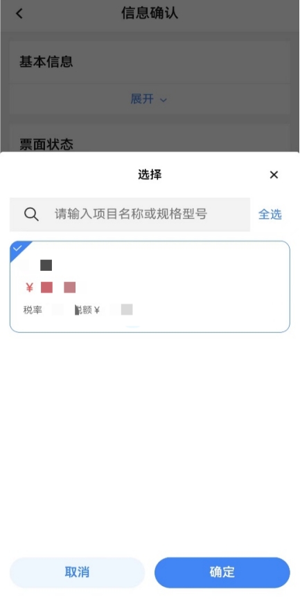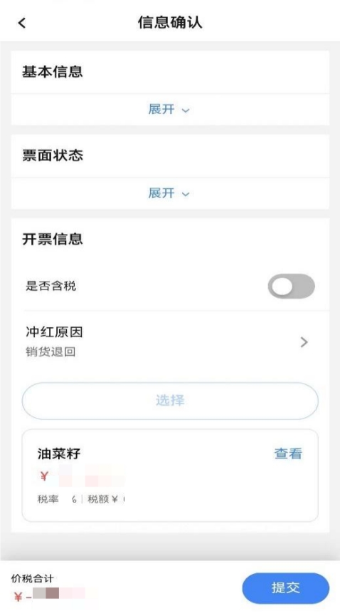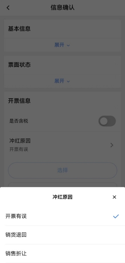 納稅人點擊要紅沖的藍(lán)字發(fā)票,進(jìn)入“信息確認(rèn)”頁面,此頁面從上至下可分為基本信息、票面狀態(tài)、開票信息??赏ㄟ^點擊【展開】下拉按鈕查看購銷雙方基本信息和藍(lán)字發(fā)票的一些票面信息和藍(lán)字發(fā)票狀態(tài)等信息。開票信息中可通過點擊【紅沖原因】選擇具體的紅沖原因,下方顯示可紅沖的項目信息。點擊【查看】按鈕可顯示可紅沖項目的規(guī)格型號、數(shù)量、金額等具體信息。