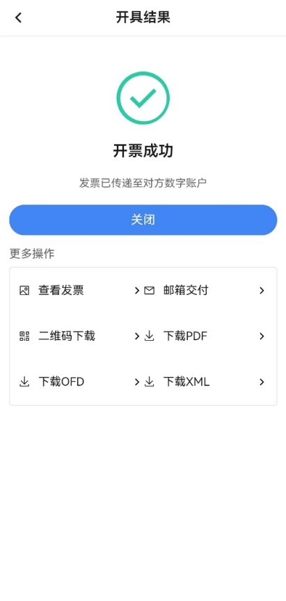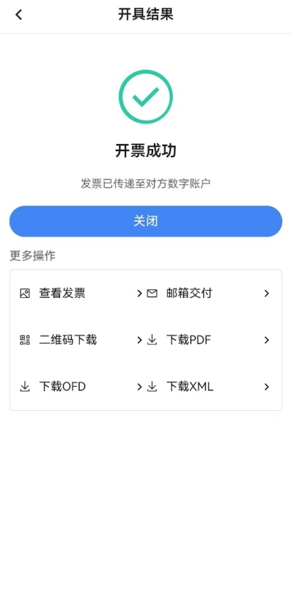 打開的確認(rèn)單狀態(tài)為“購方錄入待銷方確認(rèn)”時,點擊【確認(rèn)】,彈出確認(rèn)即開票提示,點擊【確定】,紅字發(fā)票開具成功,跳轉(zhuǎn)到“開具結(jié)果”頁面,此頁面可查看開具的紅字發(fā)票,同時展示各個發(fā)票交付渠道,可按各渠道按鈕點擊后進(jìn)行相應(yīng)交付。