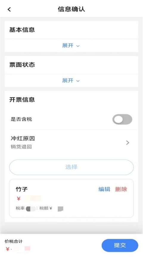 納稅人選擇具體的紅沖原因,系統(tǒng)可根據(jù)選擇的紅沖原因以及發(fā)票標(biāo)簽控制允許納稅人修改項目信息詳情頁面數(shù)據(jù)。