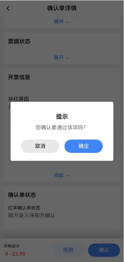 如藍(lán)字發(fā)票為web端開具的紙質(zhì)發(fā)票,在移動端發(fā)起確認(rèn)單或在web端選擇“與原藍(lán)票一致票種的紙質(zhì)發(fā)票”發(fā)起確認(rèn)單,在移動端確認(rèn)時,點擊【確認(rèn)】后,彈出“您確認(rèn)要通過該項嗎?”的提示。點擊【確定】后,提示確認(rèn)成功,還需在web端的【紅字發(fā)票業(yè)務(wù)】-【紅字發(fā)票開具】中點擊【去開票】才能成功開具紅字發(fā)票。