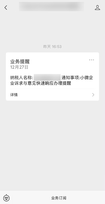 用戶通過關(guān)注微信公眾號:“北京稅務(wù)服務(wù)號”。經(jīng)實(shí)名手機(jī)號碼關(guān)聯(lián)綁定并且完成業(yè)務(wù)提醒訂閱后,即可通過個人微信接收新電子稅局APP的業(yè)務(wù)提醒與反饋,如服務(wù)提醒等,并可查看明細(xì)等。