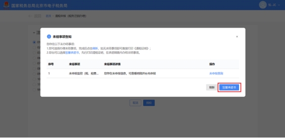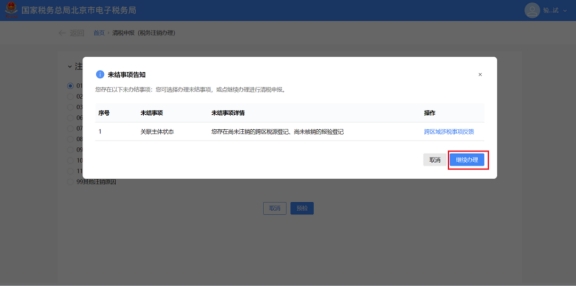 ①系統(tǒng)彈出未結事項告知界面,系統(tǒng)提示“您存在以下未辦結事項:您可選擇辦理未結事項,辦理完結后點擊刷新,繼續(xù)進行清稅申報?!?,展示未結事項以及對應辦理鏈接按鈕,點擊【繼續(xù)辦理】。