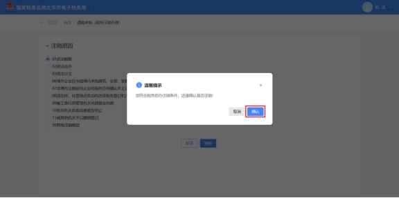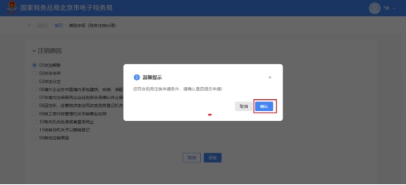 ?、谙到y(tǒng)提示“尊敬的納稅人:您符合稅務注銷申請條件,確認是否提交申請!”,點擊【確認】。