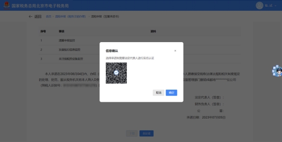 c.彈出二維碼認證窗口,系統(tǒng)提示“選擇承諾制需要法定代表人進行實名認證”,使用“電子稅務局app”進行掃碼認證,點擊【確定】。