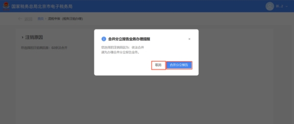 (2)注銷原因為【02依法合并】、【03依法分立】時。彈出合并分立報告業(yè)務辦理提醒:“您選擇的注銷原因為:依法合并。請先辦理合并分立報告業(yè)務。”,點擊【合并分立報告】系統(tǒng)跳轉至合并分立報告功能界面進行業(yè)務辦理(具體操作請查看《合并分立報告》操作手冊)。點擊【取消】返回功能界面。