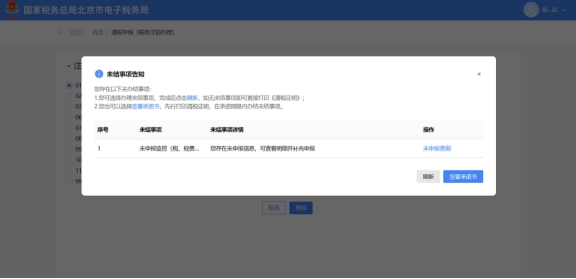 1)符合即辦注銷資格及條件,但存在未辦結事項,且未辦結事項存在非提示類事項時。彈出未結事項告知界面,系統(tǒng)提示“您存在以下未辦結事項:您可選擇辦理未結事項,辦理完結后點擊刷新,繼續(xù)進行清稅申報?!保故疚唇Y事項以及對應辦理鏈接按鈕。