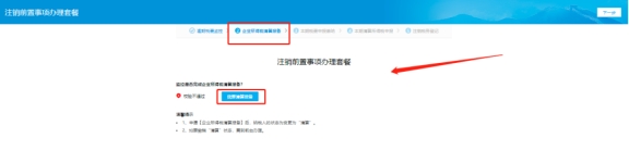 第五步:可點擊【我要清算申報】申報完成后,可點擊⑤或下一步按鈕再次進入注銷預檢,對未辦結事項進行檢測,如果沒有未辦結事項,則可以進行注銷。